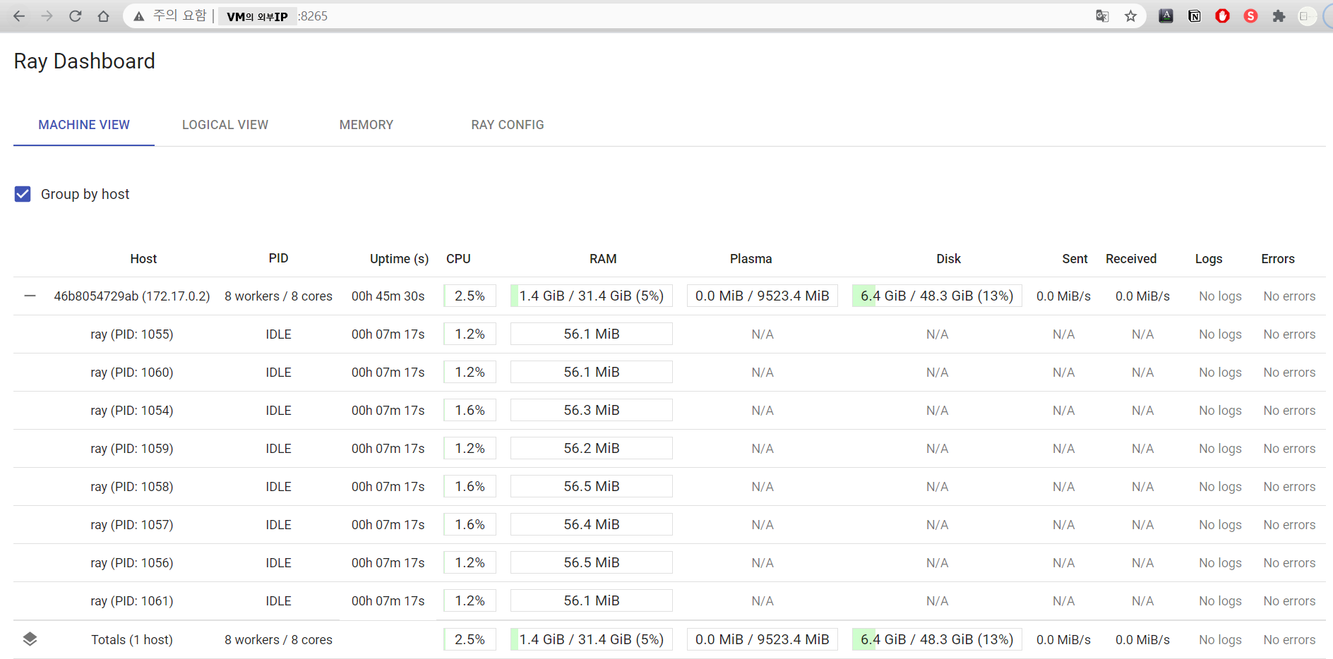그리고 실행한 Ray가 어떻게 병렬로 처리하고 있는지를 확인하기 위한 Ray Dashboard는 VM의 외부IP:8265로 접속하시면 확인 가능합니다.