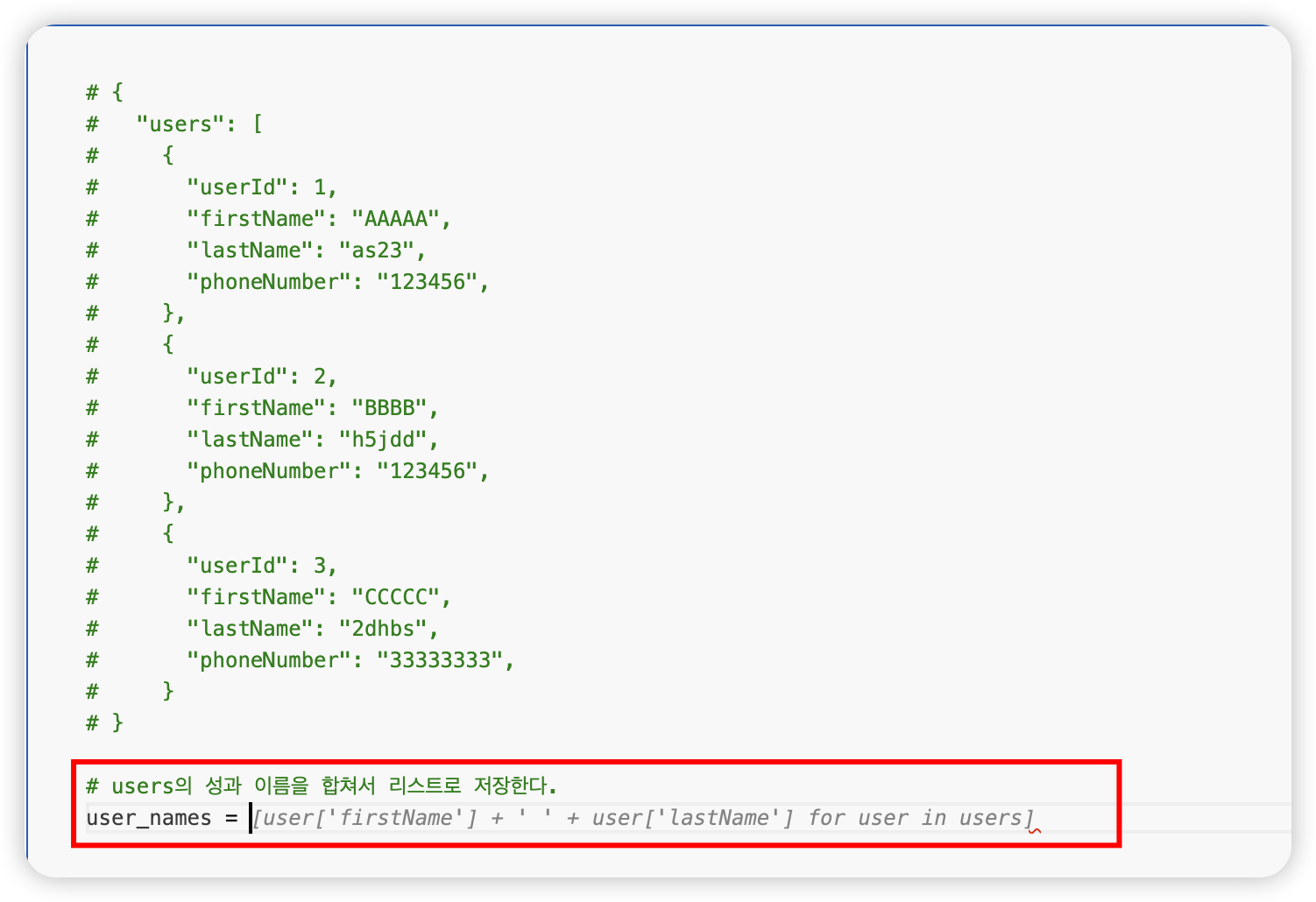 코드를 구현하기 전에 관련 데이터가 있다면 무조건 데이터를 주석으로 붙여놓자.