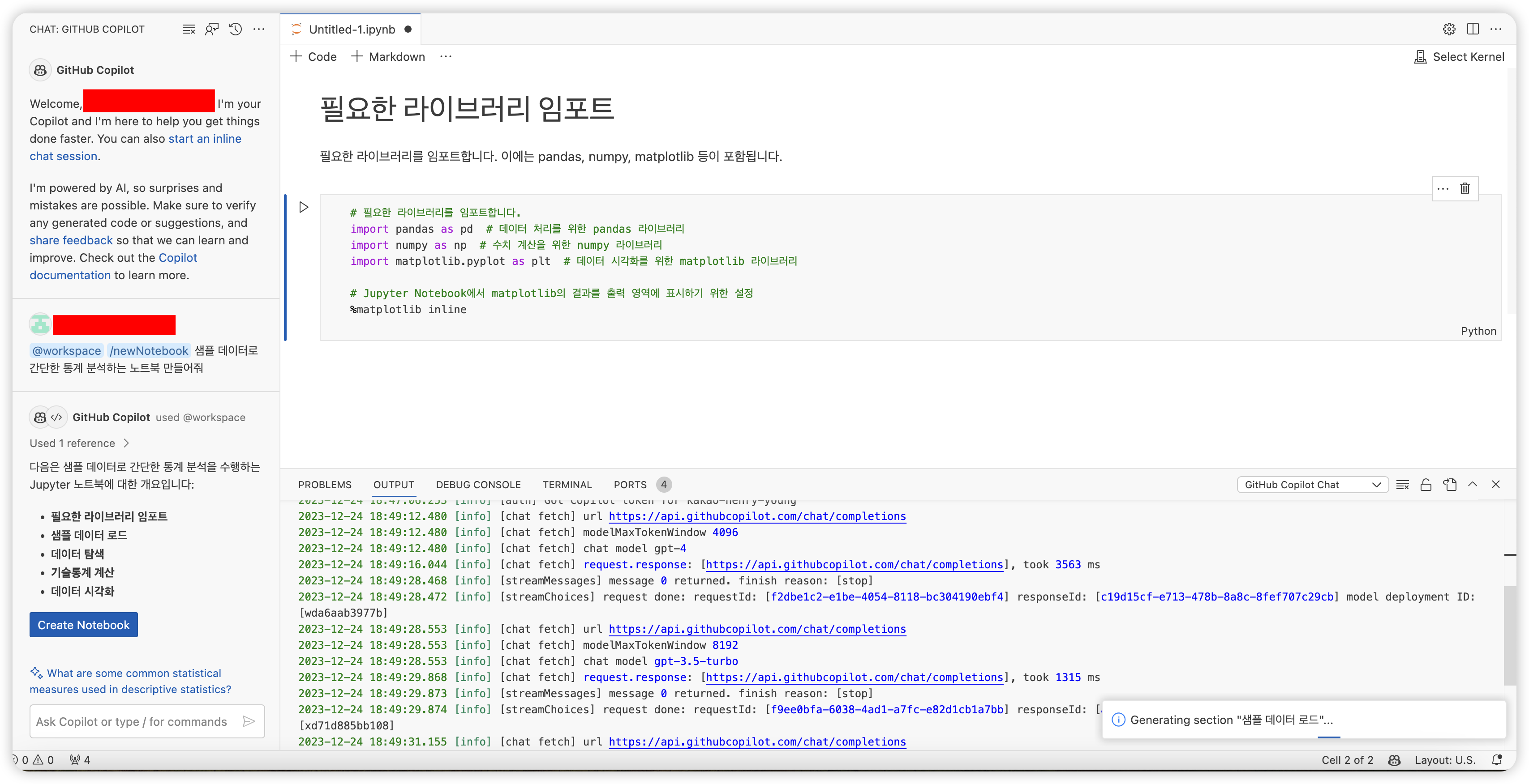 - 분석을 할 때 코파일럿 채팅은 커녕 코파일럿도 없이 쌩으로 jupyterlab에서 분석을 하는데 코파일럿이 있다 없으니 참 불편하다.