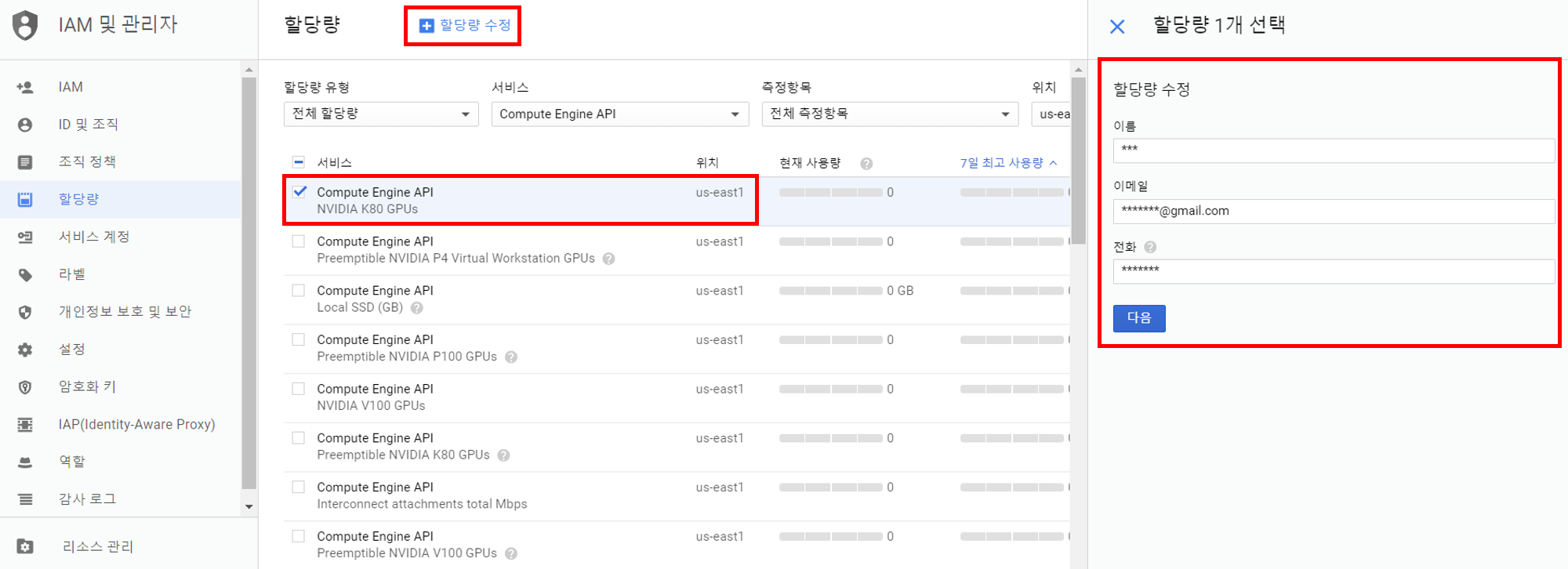 상단의 위치를 us-east1으로 변경하고 할당량을 요청할 K80을 클릭하여 활성화 후 +할당량 수정 을 클릭합니다.