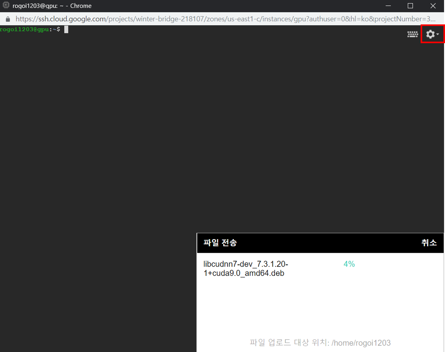 이제 인스턴스에 파일을 업로드해야 하는데, 우측 상단의 설정 아이콘을 클릭하면 파일 업로드가 있습니다. 두 파일 모두 업로드해야 합니다.