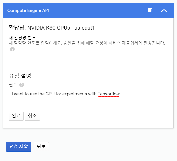 이후 할당량을 1개로 설정하고 GPU를 요청하는 이유를 적으시면 되는데, 저는 Tensorflow 실험을 위해 필요하다고 하였습니다.