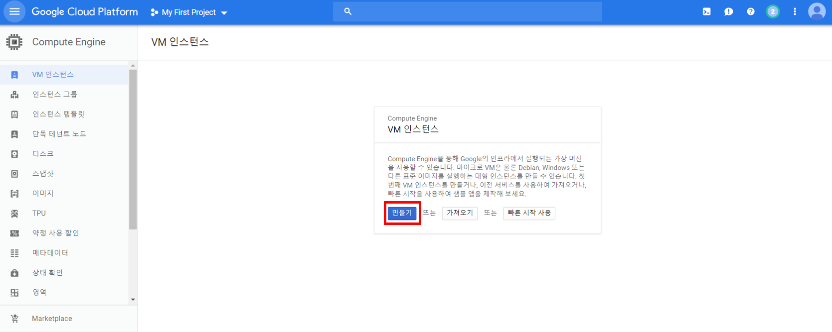 VM 인스턴스를 만들어줍시다.