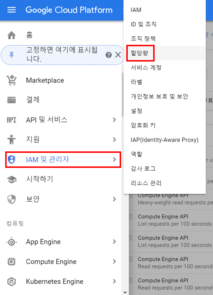 우선 위와 같이 좌측 상단의 네비게이션 바를 선택하여 메뉴 창을 여시고, 'IAM 및 관리자' 카테고리의 할당량을 선택해줍니다.