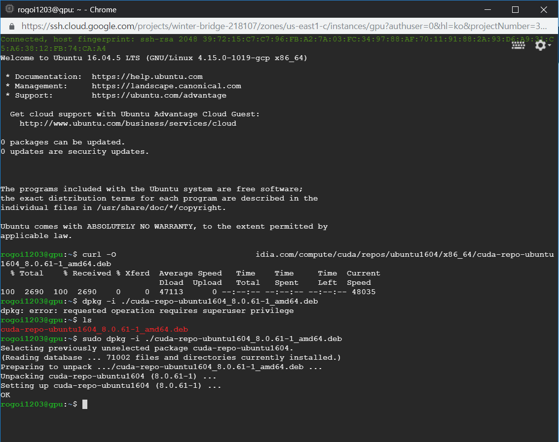 Welcome to Ubuntu 라는 말과 함께 연결이 되었습니다. 이제 CLI 환경에서 VM 인스턴스를 제어해야하는데요, GPU Driver를 설치하는 명령어는 다음과 같습니다.