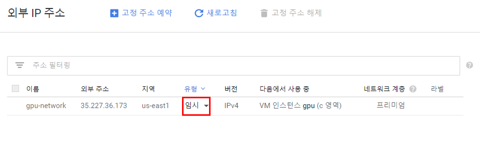 다음과 같이 VM 인스턴스의 IP가 임시로 되어있는 것을 고정으로 변경합니다. 이후 'VPC 네트워크-방화벽 규칙'로 접속합니다.
